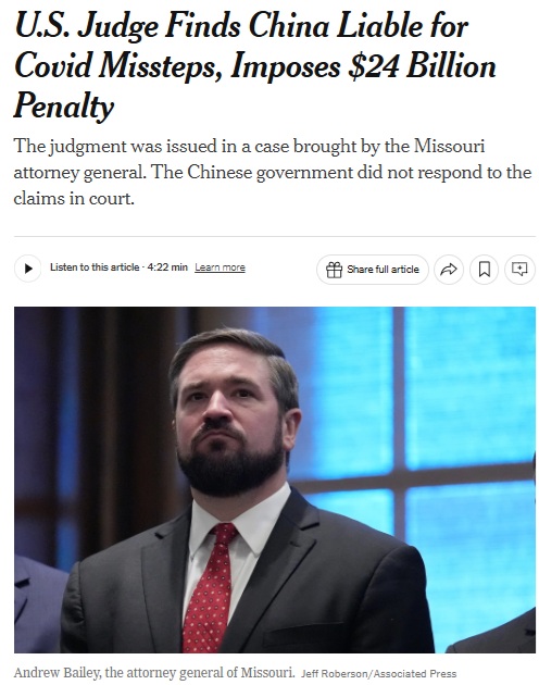 “今天,密苏里州总检察长安德鲁·贝利(Andrew Bailey)获得了一项历史性的 240 亿美元判决,指控中国共产党释放 COVID-19 疫情——这是密苏里州历史上最高判决的六倍。