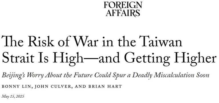 本文2025年5月15日由美国《外交事务》杂志发表,英文题目为“The Risk of War in the Taiwan Strait Is High—and Getting Higher; Beijing’s Worry About the Future Could Spur a Deadly Miscalculation Soon”,作者为林洋(Bonny Lin)、柯佛(John Culver)与贺博然(Brian Hart)。林洋是美国战略与国际问题研究中心(CSIS)中国力量项目主任兼高级顾问,柯佛是布鲁金斯学会约翰·L·桑顿中国中心的非常驻高级研究员,曾在中央情报局工作35年,并于2015至2018年期间担任美国国家情报委员会东亚事务国家情报官;贺博然是战略与国际问题研究中心中国力量项目副主任兼研究员。本文译者为陈润宇,校对为徐宇深(Emerson Tsui)。点击【这里】查看英文原文。