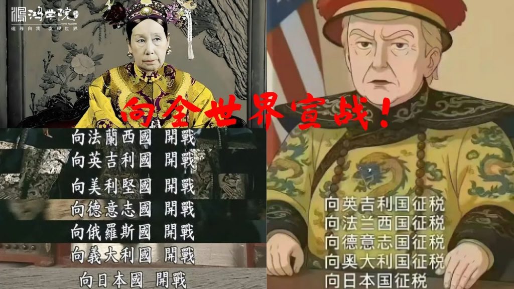 很有趣的一个故事是,在特朗普发动这场全球关税战的同一天,有一张漫画在中国网络上非常流行。在这张漫画里,特朗普穿着中国最后一个封建王朝清朝的皇帝服装,像清朝最后一个统治者慈禧太后那样,向世界宣战。1900年,慈禧仍以为清朝仍是最强大的,竟向当时世界最强大的8个国家集体宣战。几年后,清朝崩溃。
